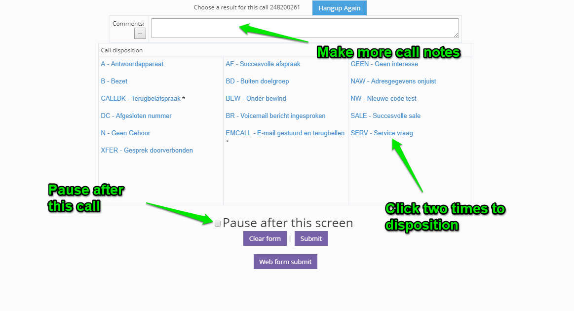 Do you not want to receive another call immediately after you subit a result, for example because you are taking a break or have to do something else? Then click the check box at the bottom of the screen to indicate that you are going to pause after this call.