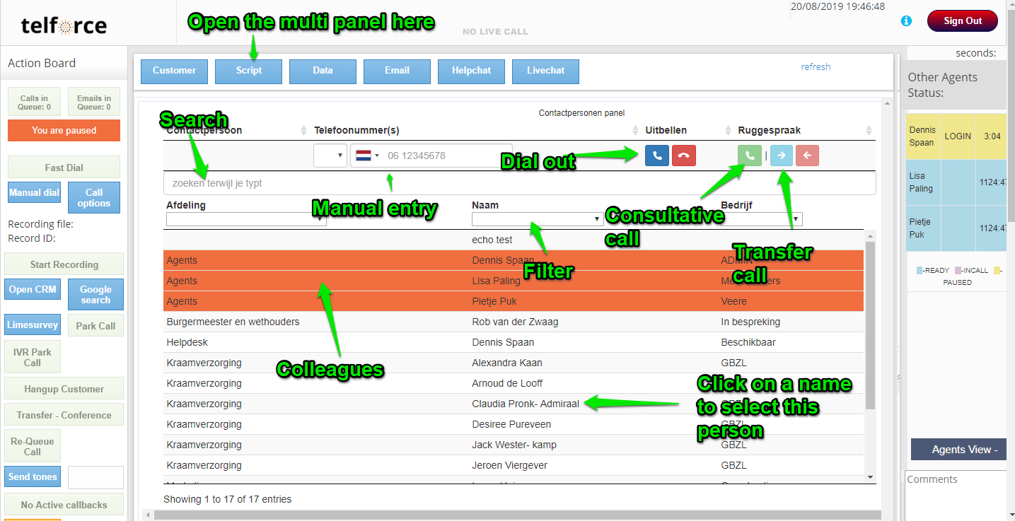 You can also use the transfer panel to manually start a call while you are paused or waiting. To do this, use the 'Manual entry' field or click on a contact person and press the dark blue button under the 'Call out' button to start the conversation.