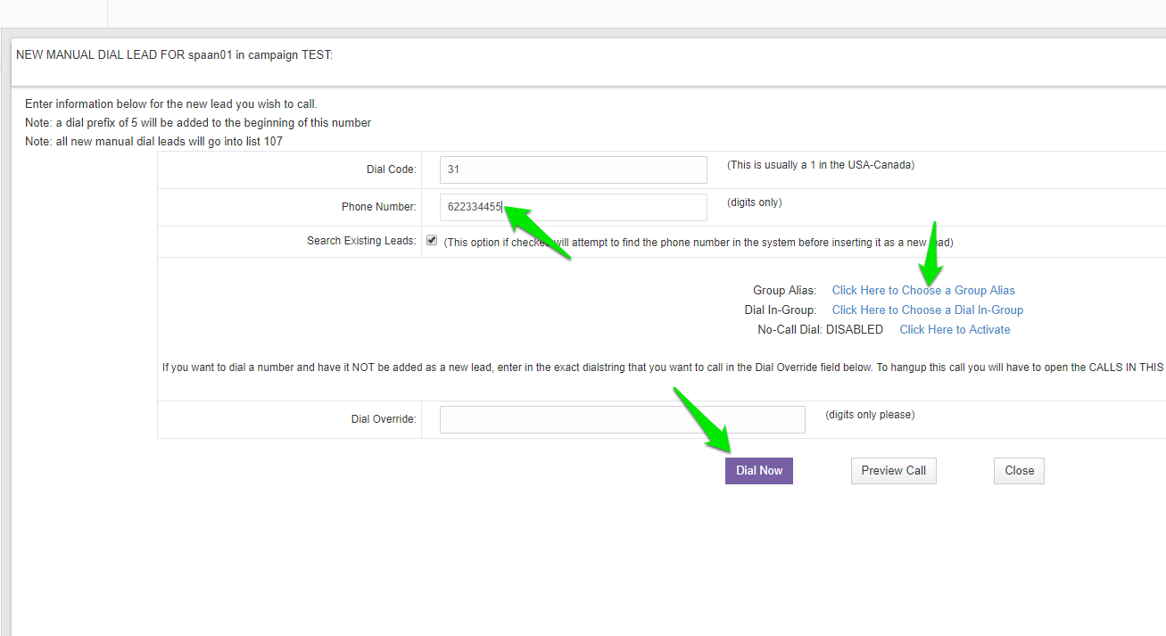 When you use the 'Manual dial' button in the left panel you will see a new page where you can enter the country code and phonenumber that you want to call.