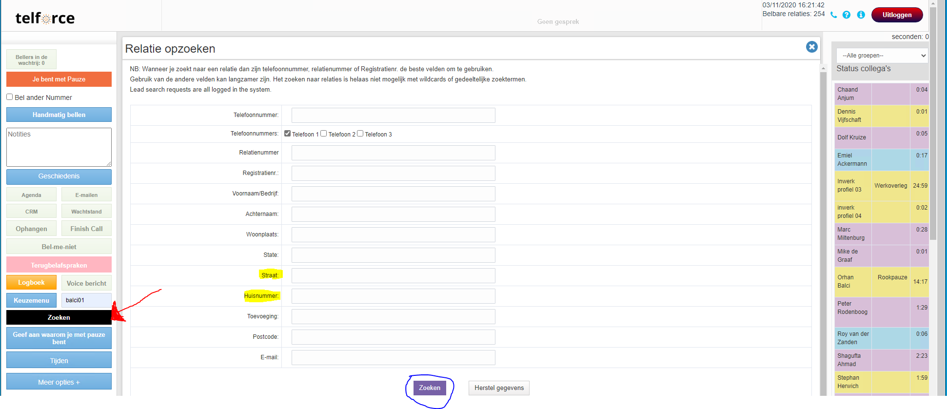 If you only have an email, zip code or street name, for example, but you want to find the customer in the system, you can do so via the search button. You must take a break first, otherwise you may receive a call before you get around to it.