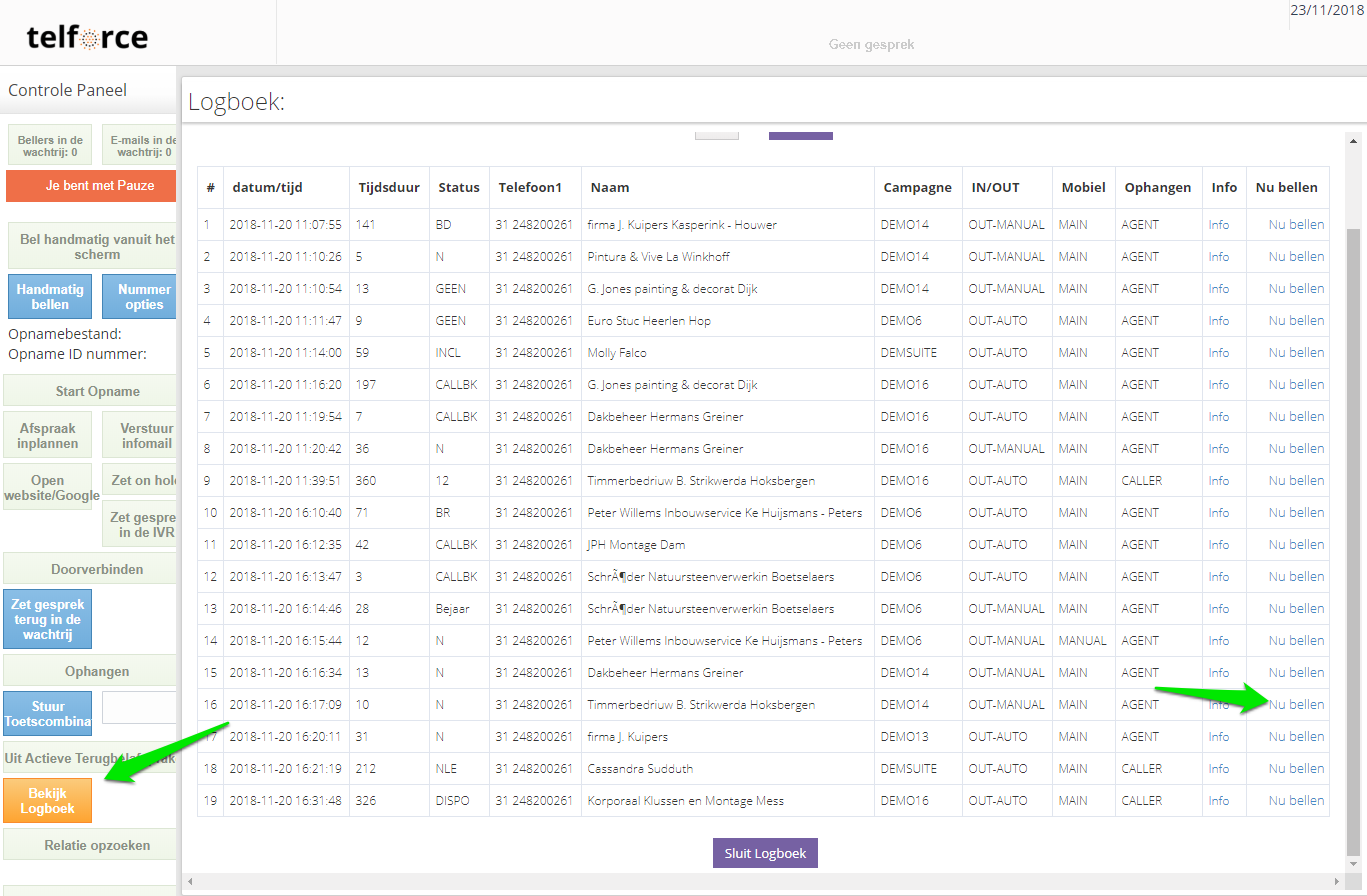 Suppose you want to call back a customer you spoke to today or check how many calls you made today or what time a specific call took place. This can be done with the call log. You must take a break first.
