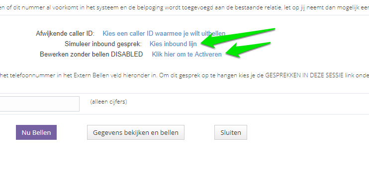 Nu komt de truc, je kunt een inbound gesprek simuleren alsof er gebeld wordt naar de relatie. Op deze manier kun je dan de relatiegegevens bewerken zonder dat je de klant hoeft te bellen. Om er voor te zorgen dat er geen daadwerkelijk inbound gesprek aan de rapportages wordt toegevoegd dien je ook de tweede optie 'Bewerken zonder bellen' te activeren: